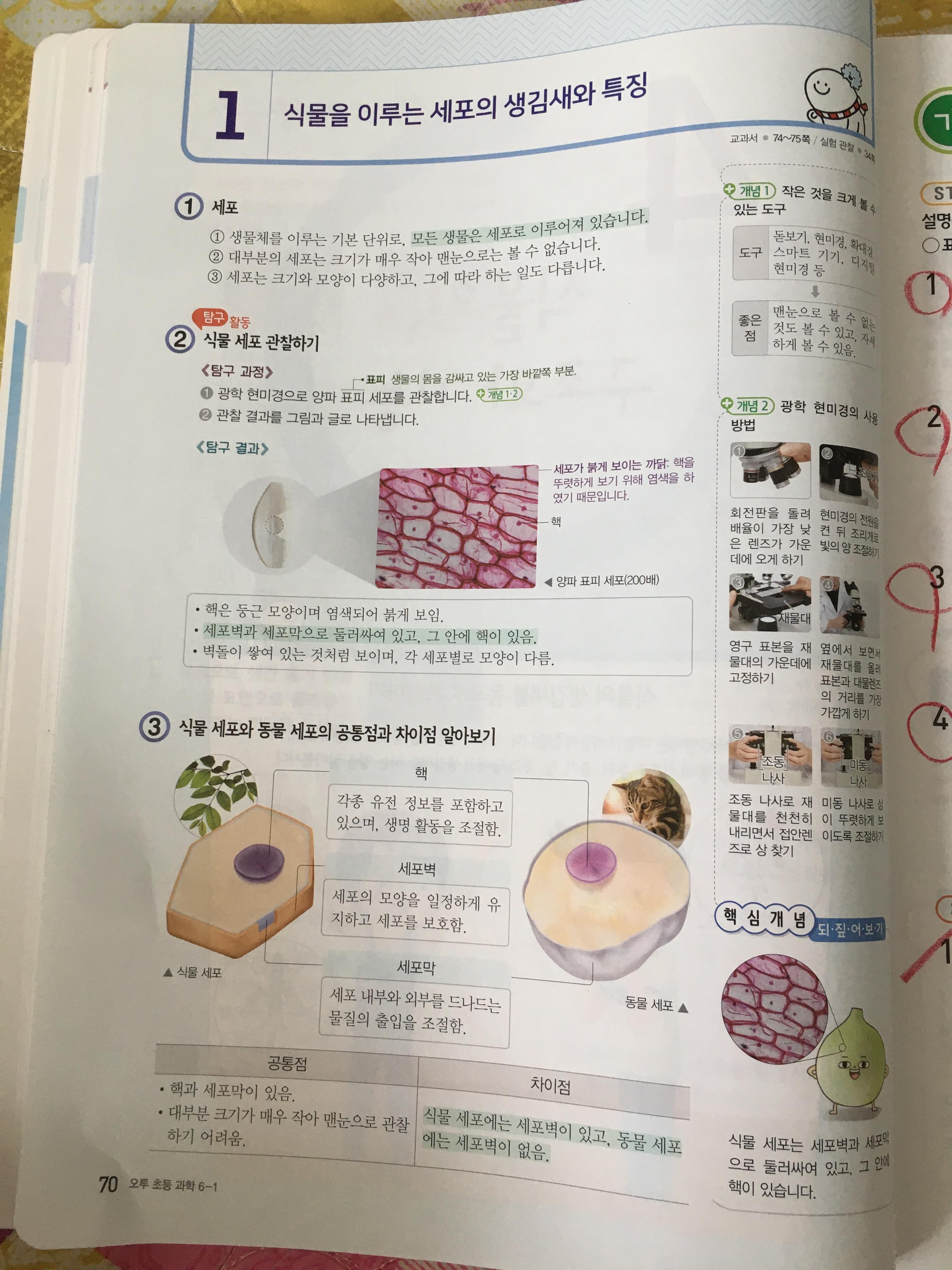 - 차이점 : 식물 세포에는 세포벽이 있고, 동물 세포에는 세포벽이 없음